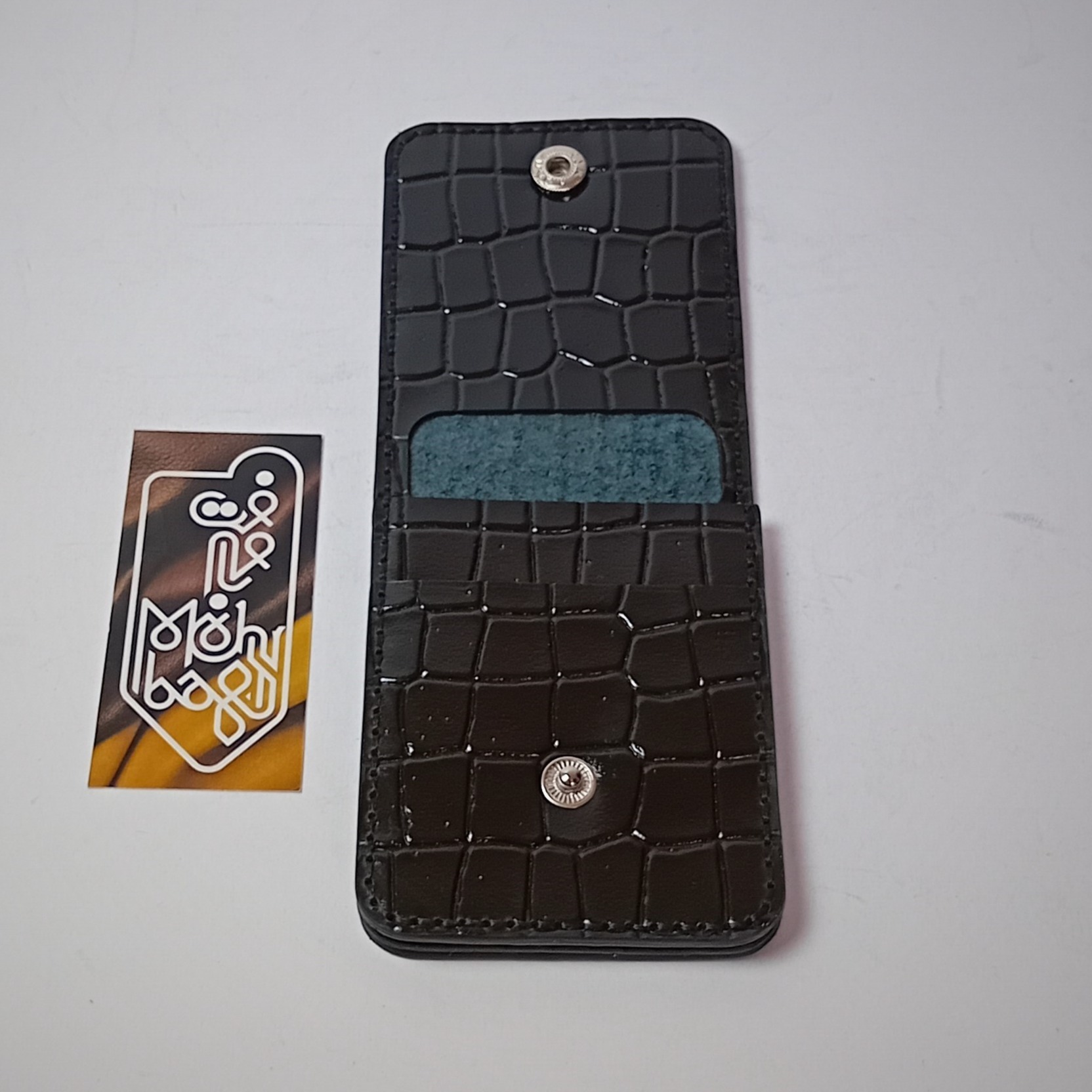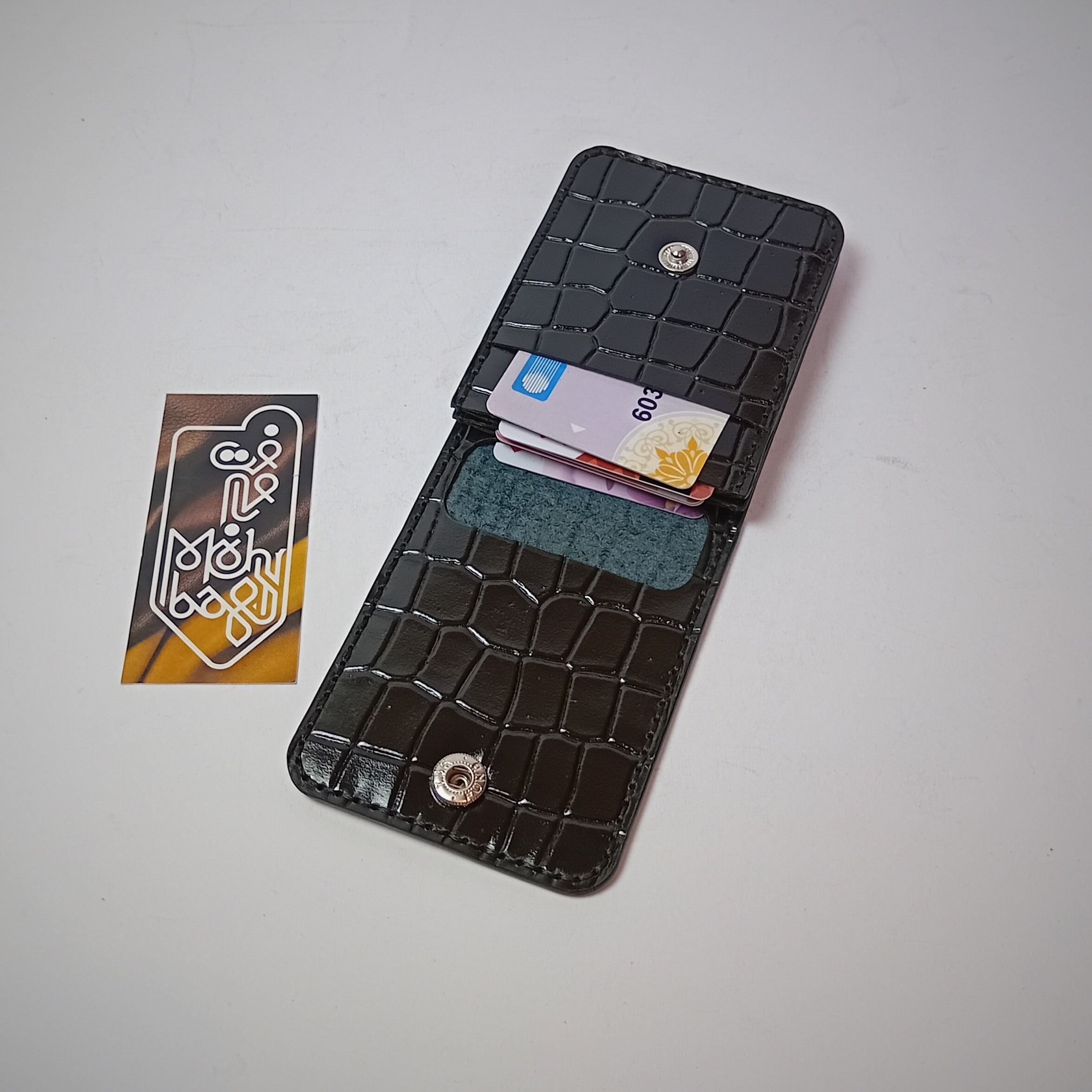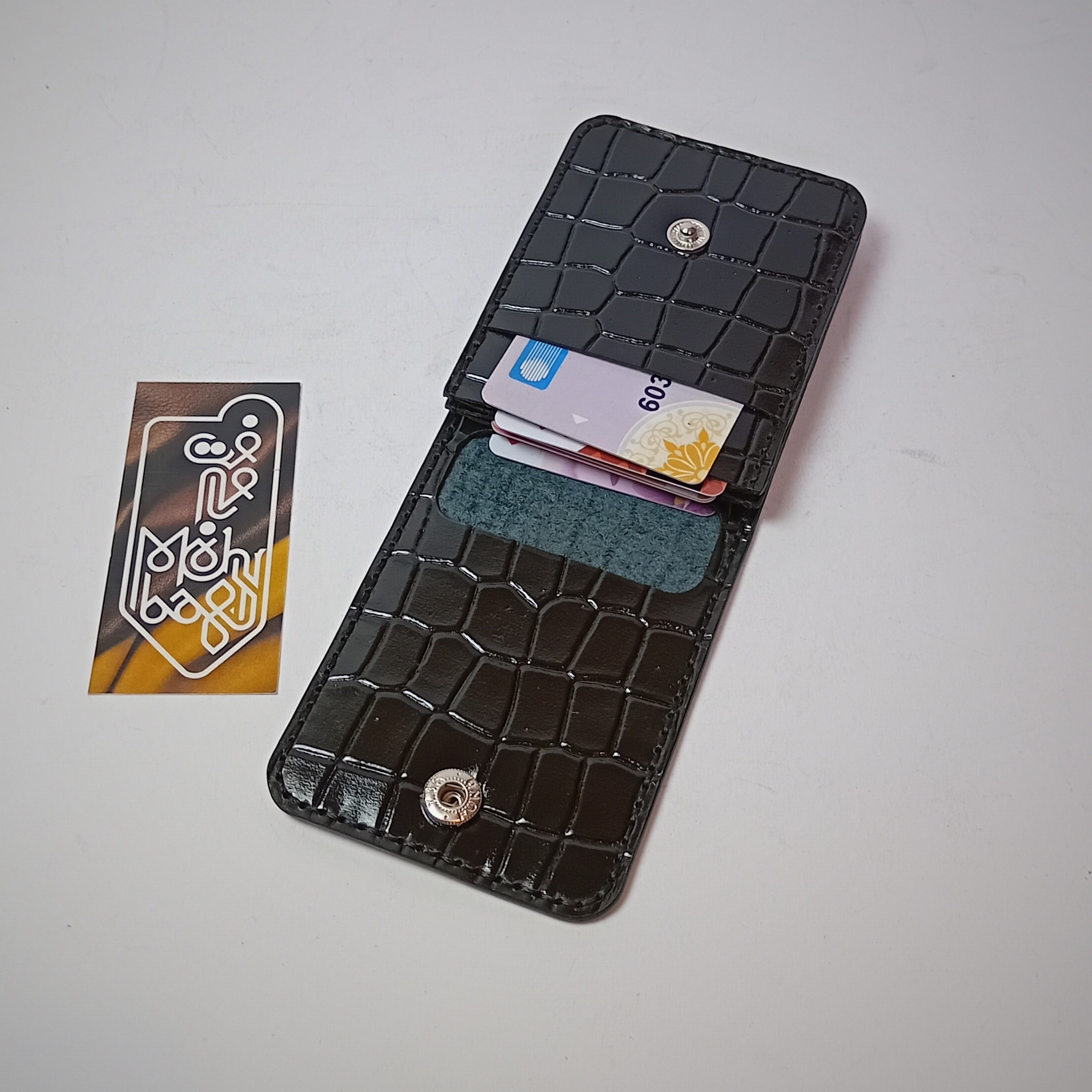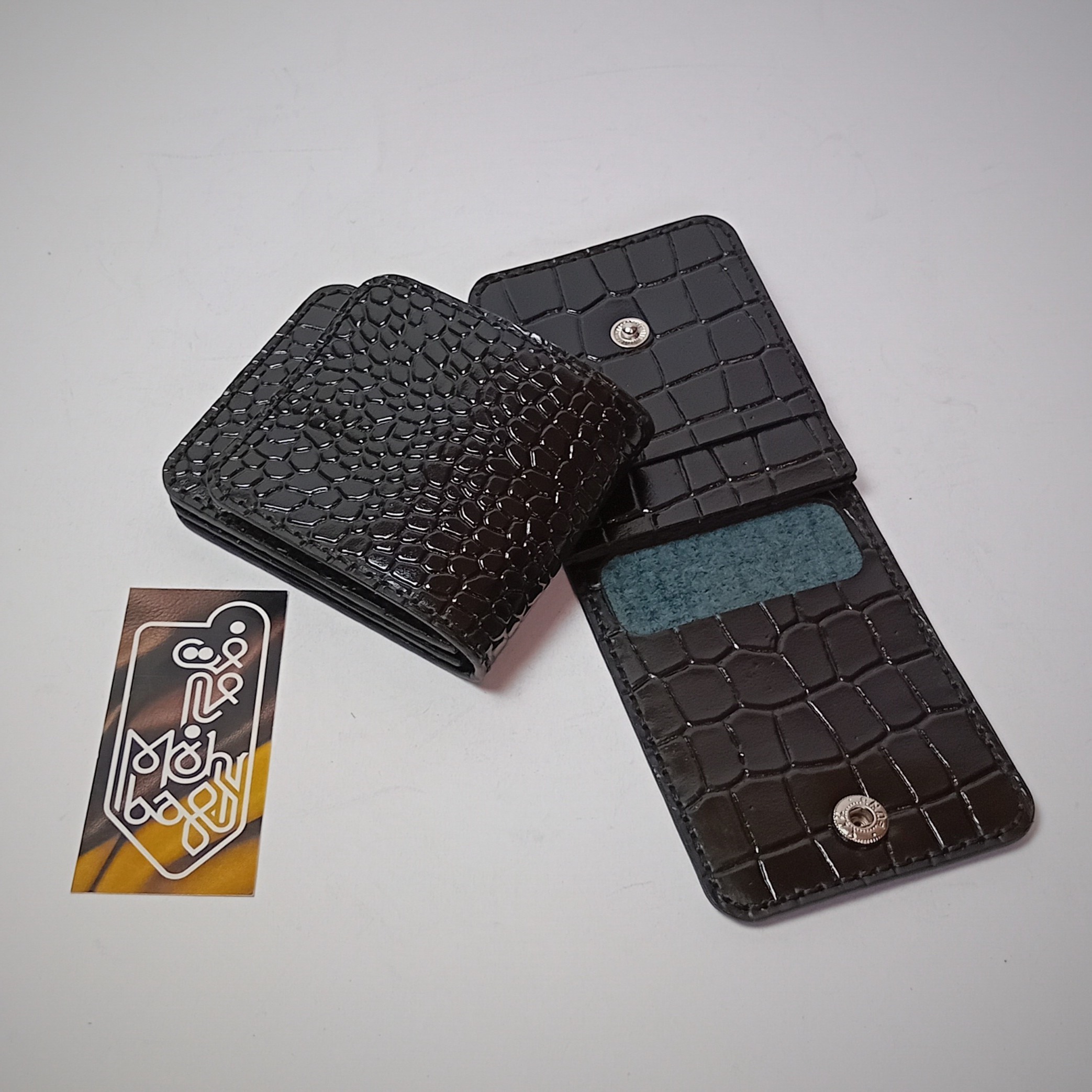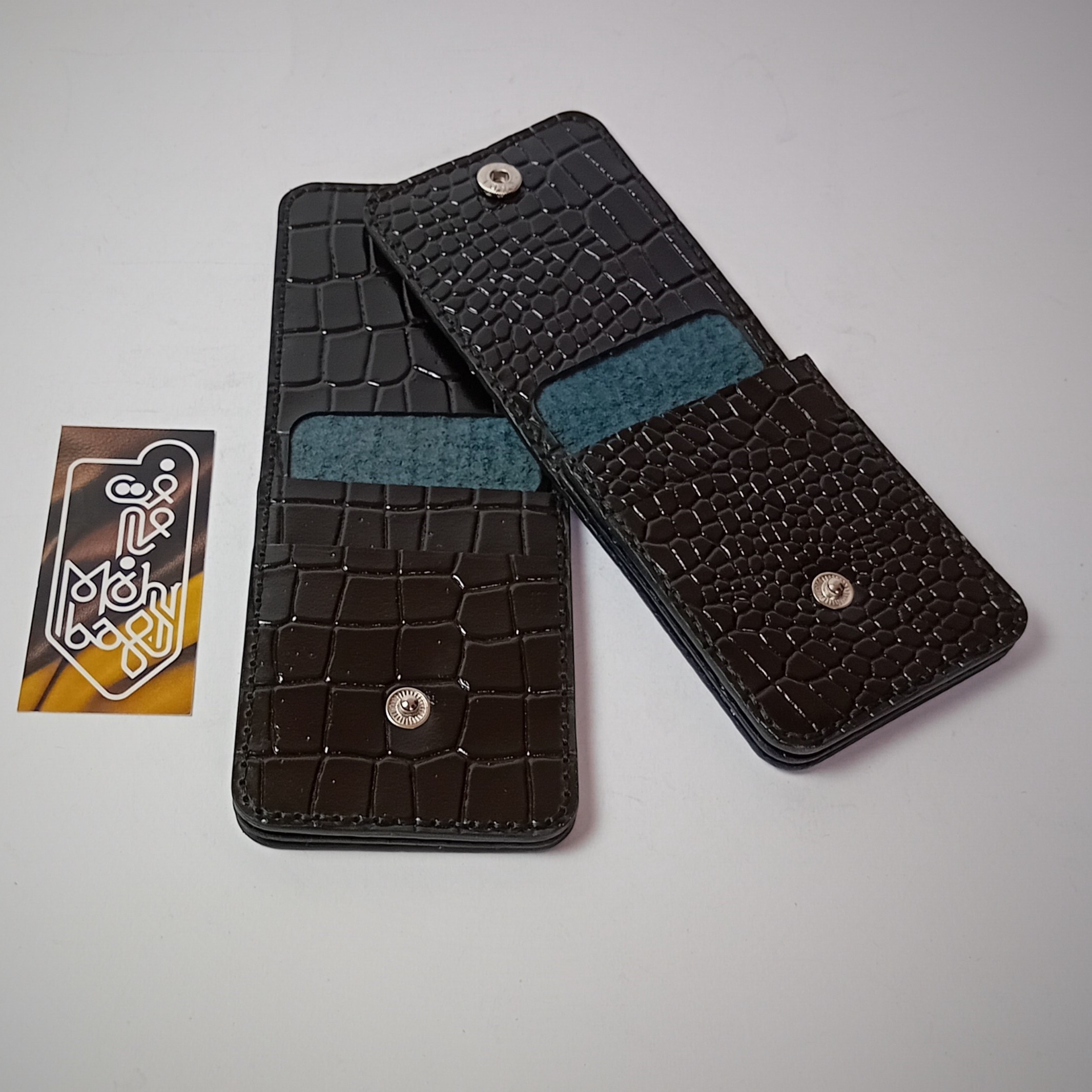 جاکارتی ، تهیه شده از چرم طبیعی گاوی ورنی ، با ظرفیت 10 الی 12 کارت بانکی در 3 قسمت، کاملا دست دوز ، دوخته شده با نخ موم زده ترک ، دارای رنگ لبه درجه یک ، بسیار سبک و شیک