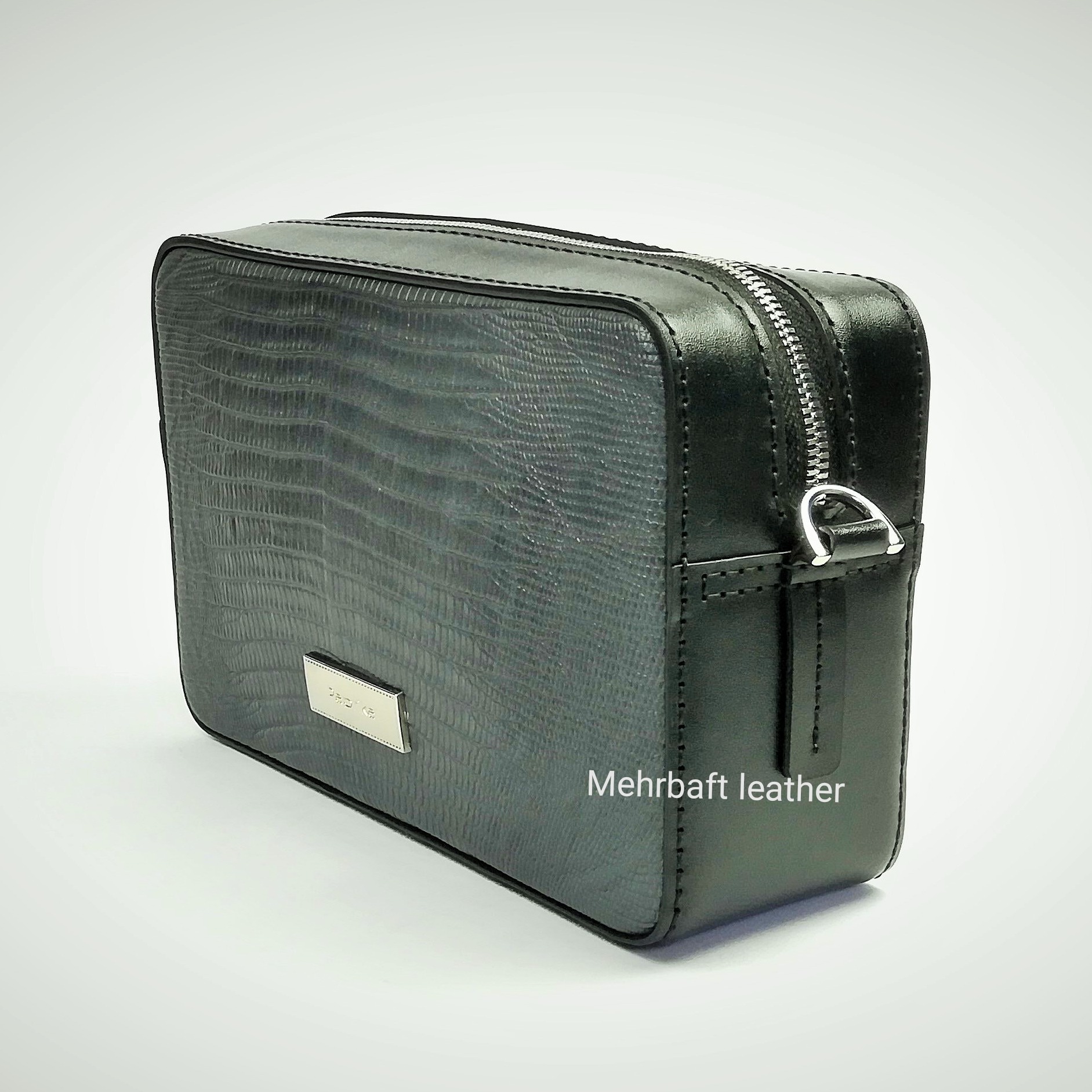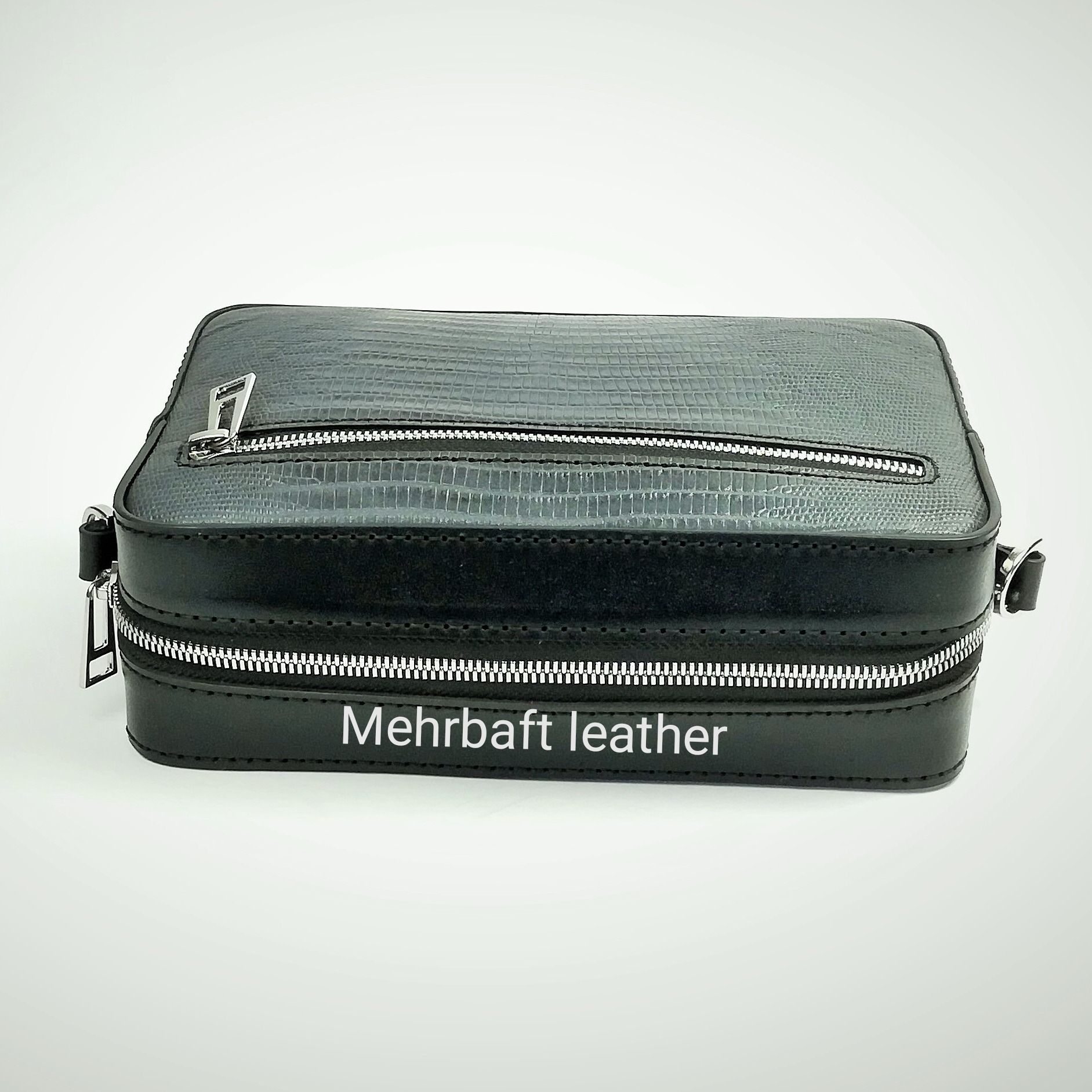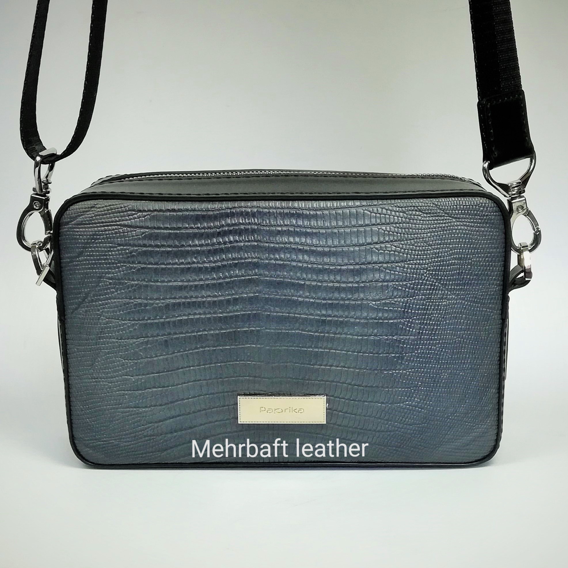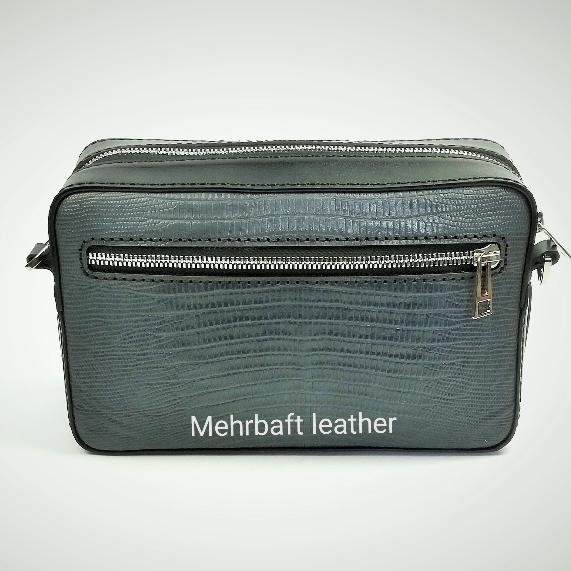 کیف کج زنانه ، تهیه شده از چرم لزارد طوسی و چرم وکیوم مشکی گاوی ، با آستر و یک جیب زیپ دار داخلی و یک جیب هم در پشت کیف ، با بند بلند برزنتی قابل تنظیم ، کاملا دست دوز ، دارای رنگ لبه با مواد درجه یک ، شیک و کاربردی