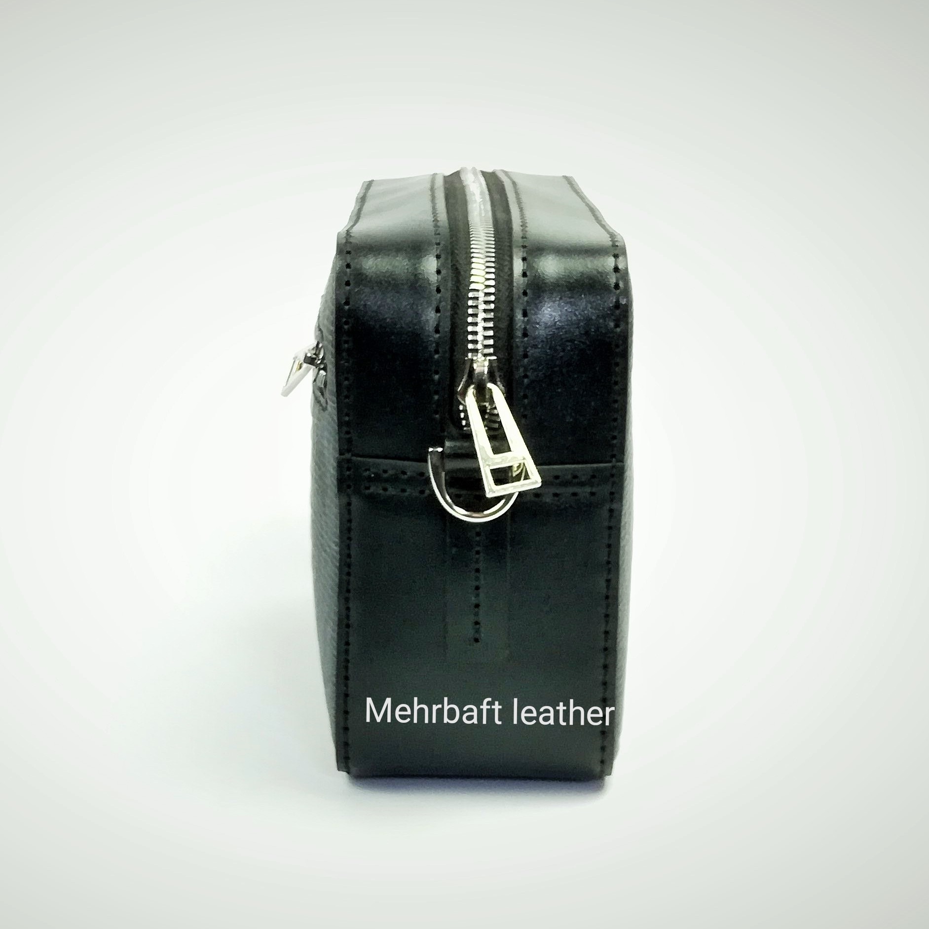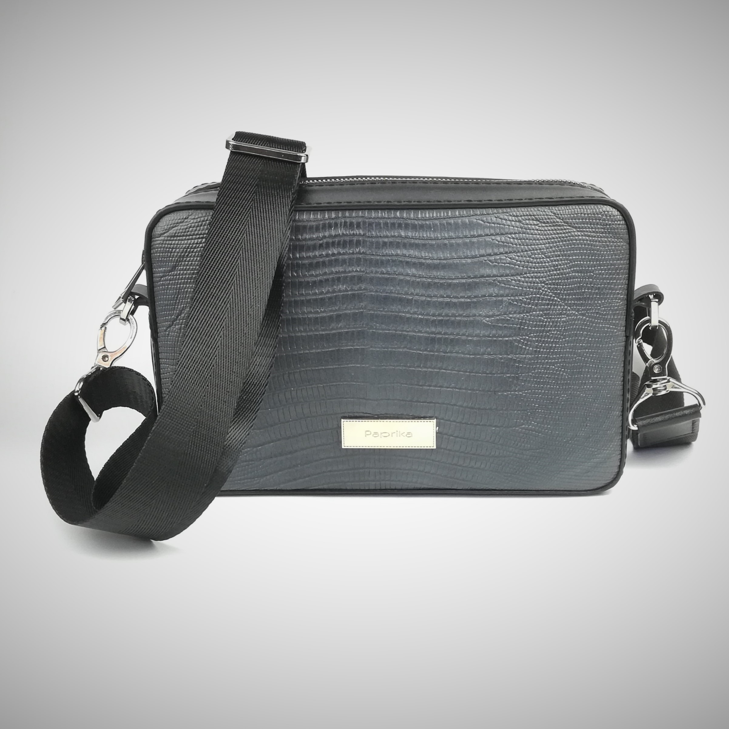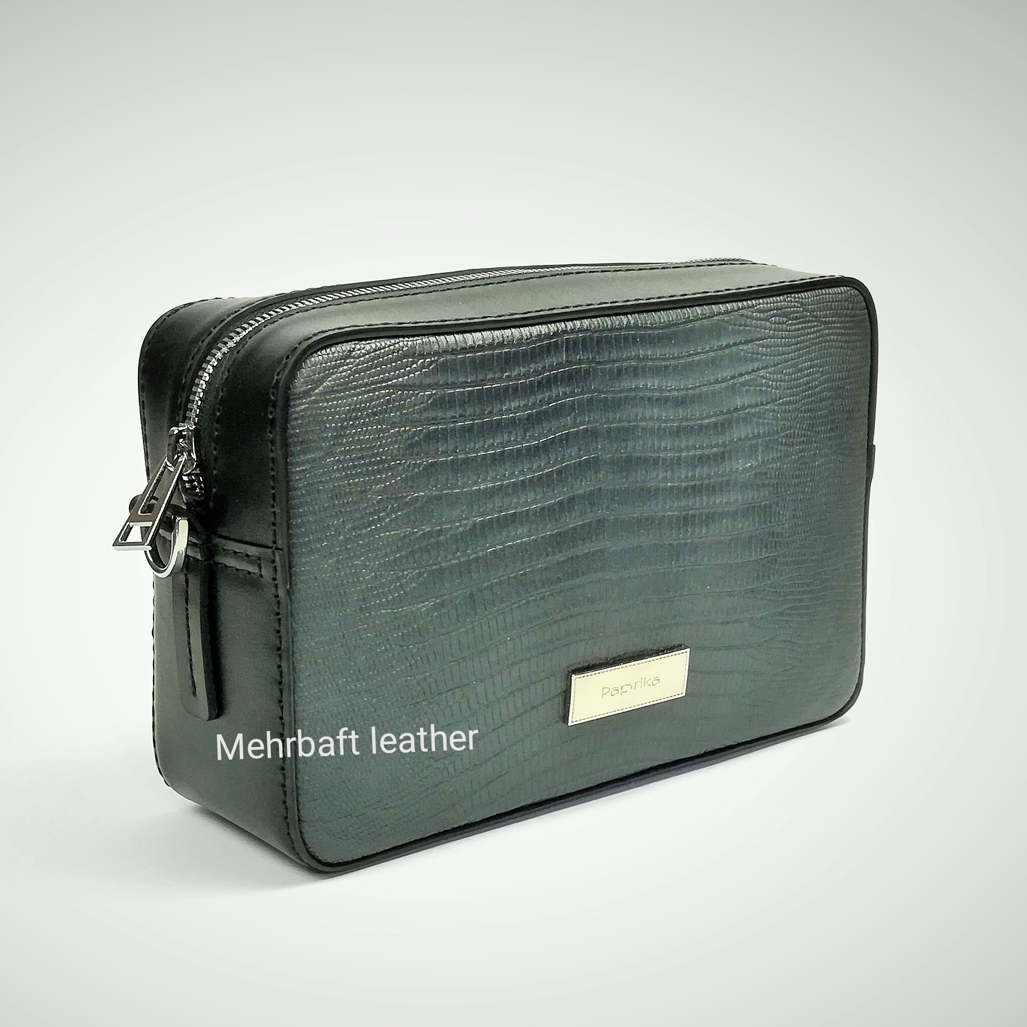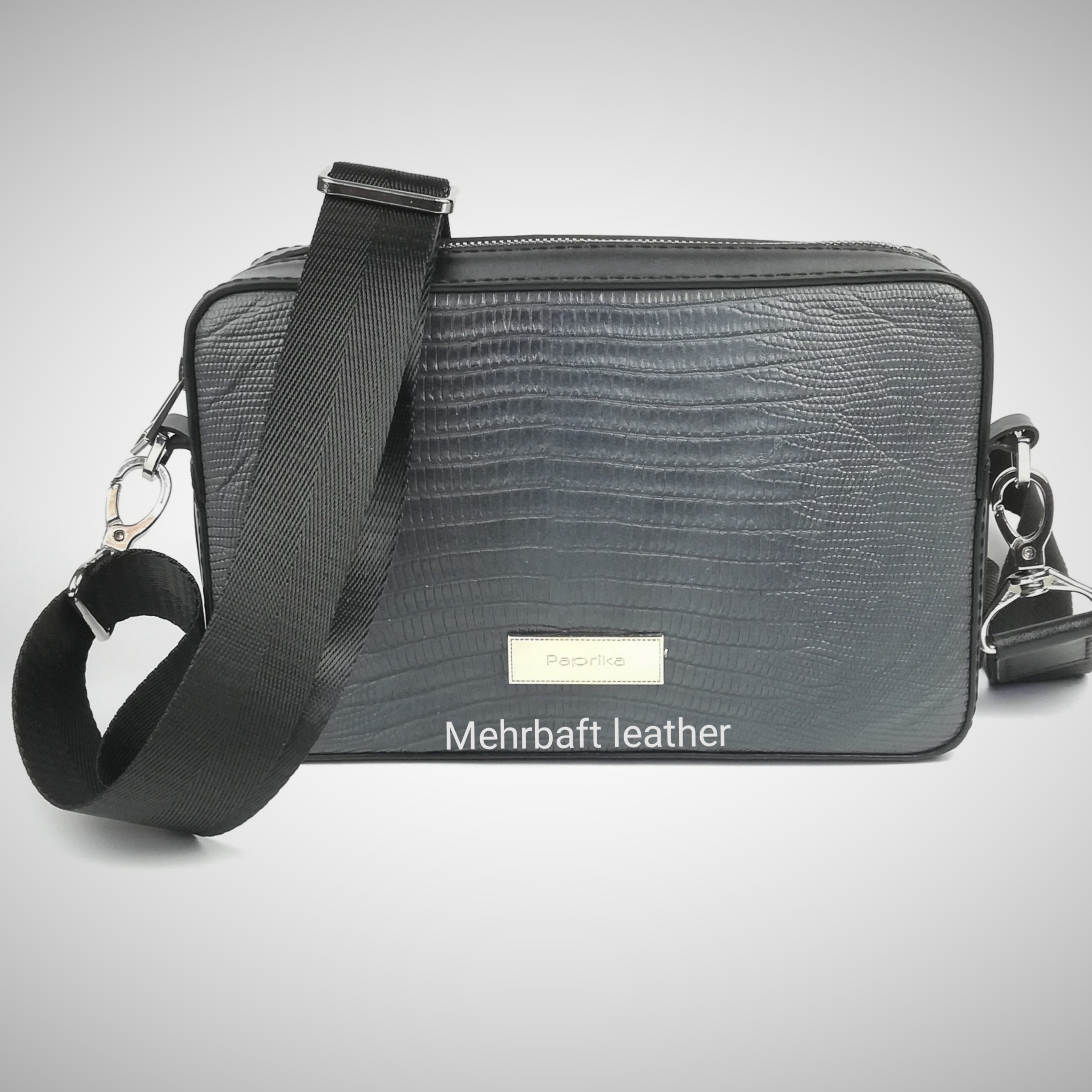 کیف کج زنانه ، تهیه شده از چرم لزارد طوسی و چرم وکیوم مشکی گاوی ، با آستر و یک جیب زیپ دار داخلی و یک جیب هم در پشت کیف ، با بند بلند برزنتی قابل تنظیم ، کاملا دست دوز ، دارای رنگ لبه با مواد درجه یک ، شیک و کاربردی